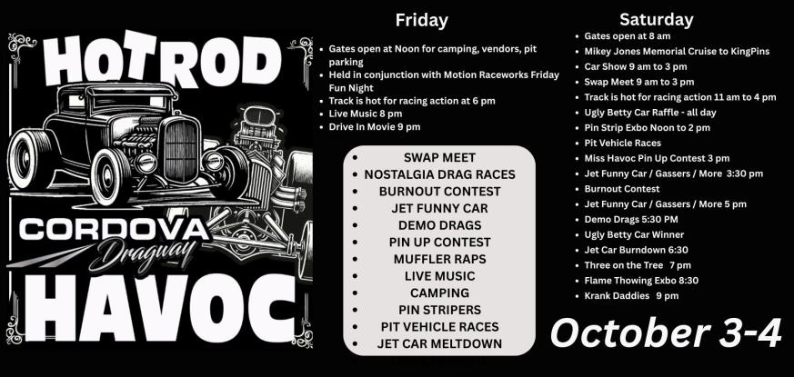 October 04 Saturday HOT ROD HAVOC Cordova Dragway Oct 04 HOT ROD HAVOC Cordova Dragway Purchase Tickets Pricing Information Spectator $15.00 ADULT SATURDAY $10.00 SWAP MEET $35.00 WEEKEND PASS $20.00 PIN UP CONTEST $20.00 PIT VEHICLE Driver $25.00 DEMO DRAGS $15.00 Test & Tune Important Times Location Cordova Dragway 19425 IL RT 84 N Cordova IL 61242 Driver Information Spectator Information TECH CARD: $15 DEMO DRAGS: $25 PIN UP CONTEST: $20 SWAP SPACE: $10 PIT VEHICLE RACE: $20 CAR SHOW ENTRY IS INCLUDED WITH YOUR SATURDAY ENTRY ADULTS (12+): $15 PER DAY or $35 WEEKEND PASS(includes camping) Back Please select the type of admission you would like to purchase HOT ROD HAVOC - Driver Purchase Tickets TECH CARD: $15 DEMO DRAGS: $25 PIN UP CONTEST: $20 SWAP SPACE: $10 PIT VEHICLE RACE: $20 CAR SHOW ENTRY IS INCLUDED WITH YOUR SATURDAY ENTRY HOT ROD HAVOC - Spectator Purchase Tickets ADULTS (12+): $15 PER DAY or $35 WEEKEND PASS(includes camping)