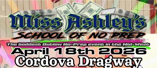 April 18 Saturday MISS ASHLEY'S SCHOOL OF NO PREP Cordova Dragway Apr 18 MISS ASHLEY'S SCHOOL OF NO PREP Cordova Dragway Purchase Tickets Pricing Information Spectator $25.00 ADULT SATURDAY $15.00 AGES 15-17 Important Times FRIDAY: PARKING: 4PM-9PM SATURDAY: GATES OPEN: 8AM RACING BEGINS: 10:30 AM SCHEDULE: 10:30-11:30AM: TNT 12PM: DRIVERS MEETING & CHIP DRAW 12:30 PM: 1ST ROUND Location Cordova Dragway 19425 IL RT 84 N Cordova IL 61242 Spectator Information SAT ADULT (18+): $25 AGES 15-16: $15 14 & UNDER: FREE SCHEDULE: 10:30-11:30AM: TNT 12PM: DRIVERS MEETING & CHIP DRAW 12:30 PM: 1ST ROUND Back Please select the type of admission you would like to purchase MISS ASHLEY'S SCHOOL OF NO PREP - Spectator Purchase Tickets SAT ADULT (18+): $25 AGES 15-16: $15 14 & UNDER: FREE SCHEDULE: 10:30-11:30AM: TNT 12PM: DRIVERS MEETING & CHIP DRAW 12:30 PM: 1ST ROUND